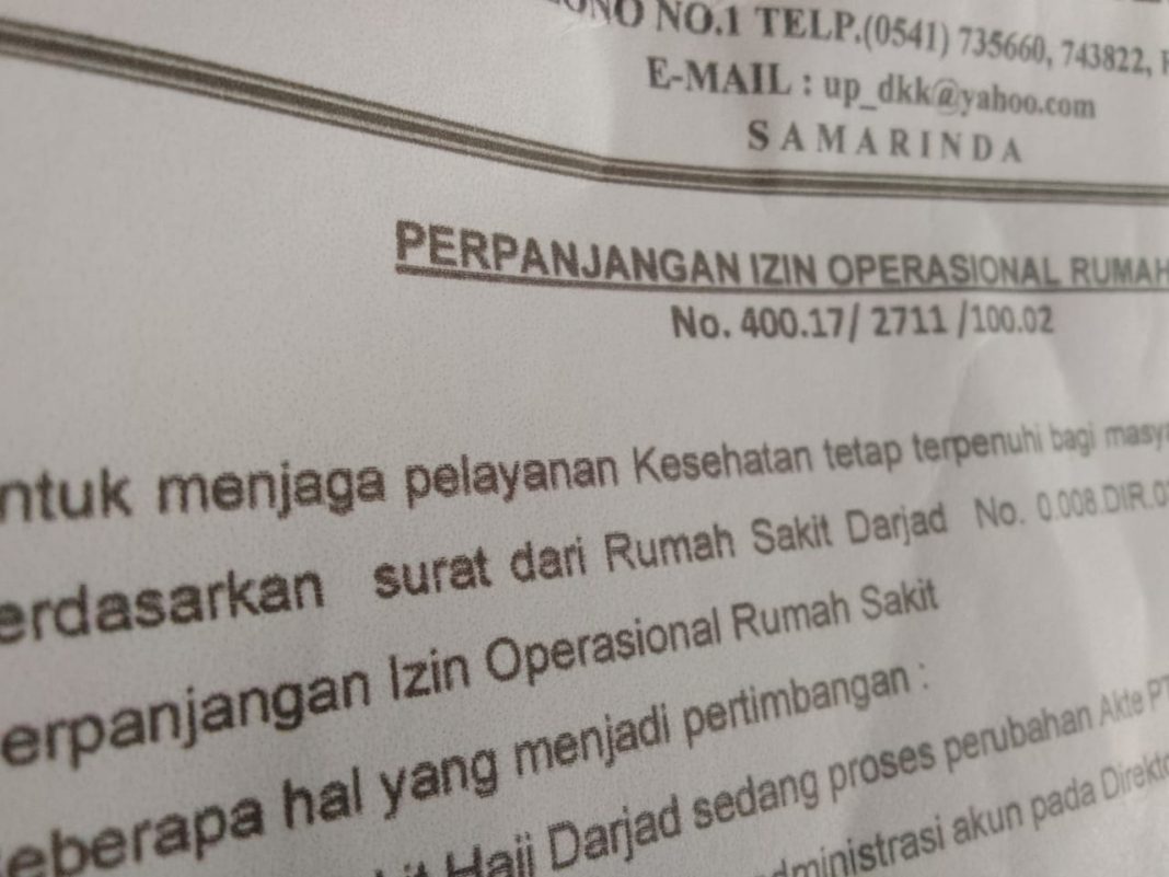 AKSELERASI – Kepala Dinas Kesehatan Kota Samarinda, dr Ismid Kusasih, mengatakan izin operasional Rumah Sakit Haji Darjad telah habis. Sesuai surat Perpanjangan Izin Operasional Rumah Sakit Nomor 400.17/1711/100.02, izin tersebut berakhir pada Sabtu 17 Juni 2023. Pun menurut aturan yang berlaku, RS Haji Darjad hanya diizinkan melayani pasien rawat jalan dan pasien di Unit Gawat Darurat.