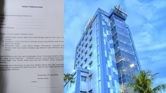 Dalam surat pernyataan itu, ada tiga poin utama. Salah satunya adalah di poin ketiga, dimana karyawan diminta untuk menerima upah/gaji sesuai kemampuan finansial RS Haji Darjad, sekalipun upah/gaji yang diterima dibawah Upah Minimum Kabupaten/Kota atau UMK.