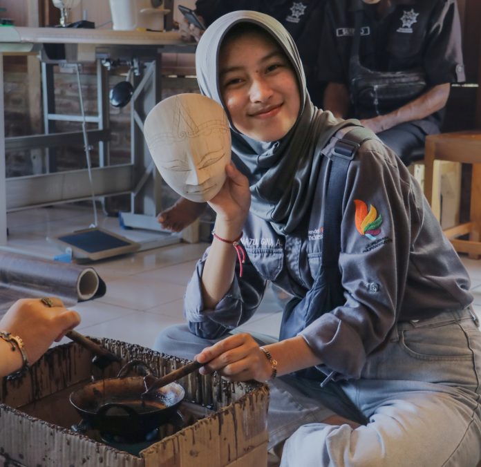 Penulis saat belajar membatik topeng di Desa Wisata Nglanggeran. (FOTO: Dok. Pribadi)