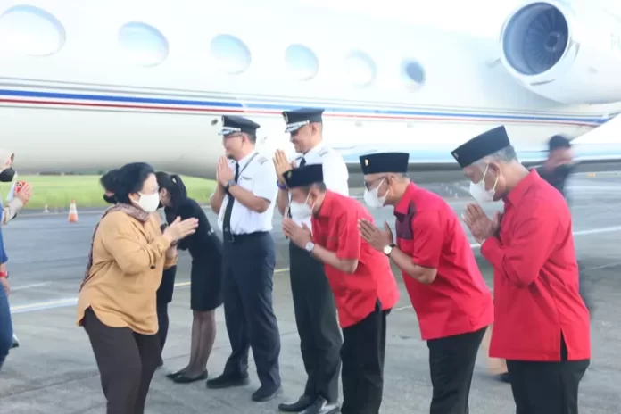 AKSELERASI – Kehadiran Megawati Soekarnoputri, Ketua Umum Partai Demokrasi Indonesia Perjuangan, disambut Wakil Ketua Dewan Perwakilan Rakyat Daerah Kalimantan Timur, Muhammad Samsun. Mantan Presiden ke 5 itu mendarat di Bandara Internasional Sultan Aji Muhammad Sulaiman Sepinggan, Kota Balikpapan, Selasa 21 Februari 2023.